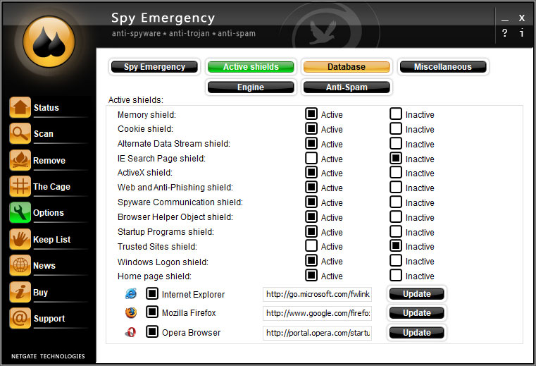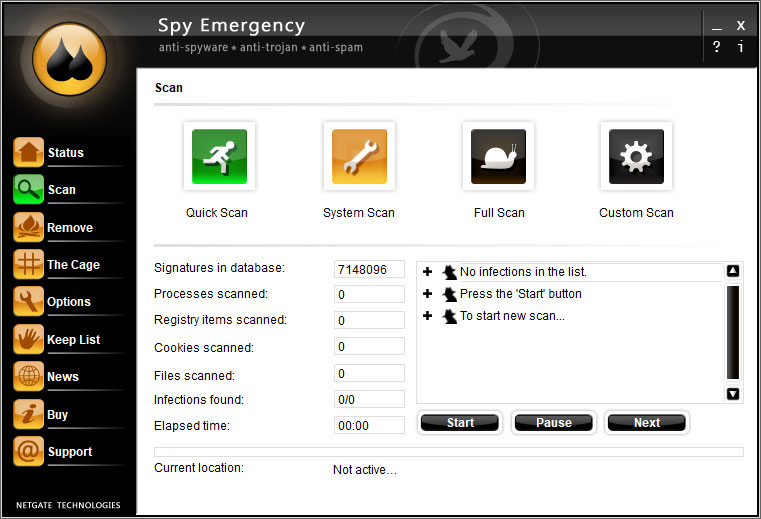 يتميز برنامج Spy Emergency بواجهة أنيقة ومنظمة جيدًا، ويتمكن من توفير واجهة مستخدم بديهية إلى جانب محرك المسح القوي. فهو يتمتع بالمظهر والذكاء اللازمين لجعل يومك أفضل من خلال مكافحة طفيليات الإنترنت والعدوى المحتملة. يشير القسم الأول من التطبيق إلى الحالة ويعرض إحصائيات المسح ومعلومات الحماية.